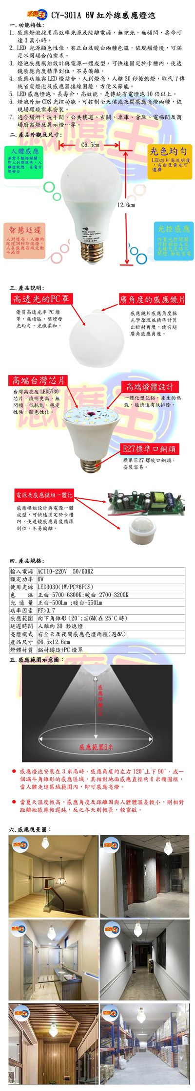 6W紅外線感應燈泡